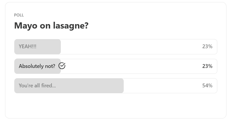 In the last newsletter we offered you all a chance to restore our faith in humanity with this ‘mayo on lasagne’ poll. Well, the results are in, and we can now confirm… 🥁